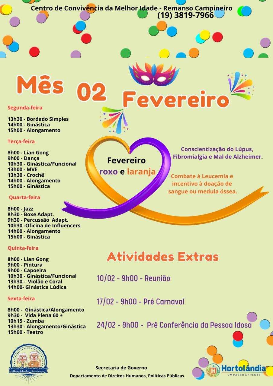 Fevereiro será movimentado com diversas atividades para os idosos no CCMI (Centro de Convivência da Melhor Idade) do Remanso Campineiro, espaço da Prefeitura de Hortolândia. Às segundas-feiras, o local oferecerá aulas de bordado simples, ginástica e alongamento. Às terças-feiras, poderão ser realizadas aulas de lian gong, dança, ginástica funcional, MVE, crochê, alongamento e ginástica. Nas quartas-feiras de fevereiro, acontecem aulas de jazz, boxe adaptado, percussão adaptada, oficina de influencers, alongamento e ginástica.