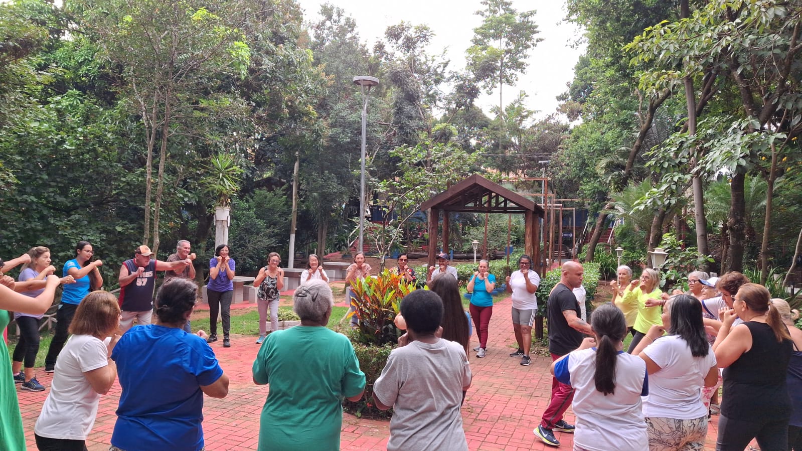 Cerca de 70 idosos, moradores de Hortolândia, tiveram uma manhã diferente, nesta segunda-feira (28/04), com diversas atividades lúdicas ao ar livre, no Parque Socioambiental Irmã Dorothy Stang, no Jd. Nossa Senhora de Fátima. Fizeram alongamentos, aula de box, piquenique e até mesmo uma animada batucada. Em seguida, puderam assistir ao primeiro episódio da série “Um espião infiltrado”, da Netflix, na Sala Ecológica. A série conta a história de um professor aposentado que passa por experiências de dor e perda, após a morte da esposa e da vida monótona e distante da filha, e tem a chance de recomeçar.