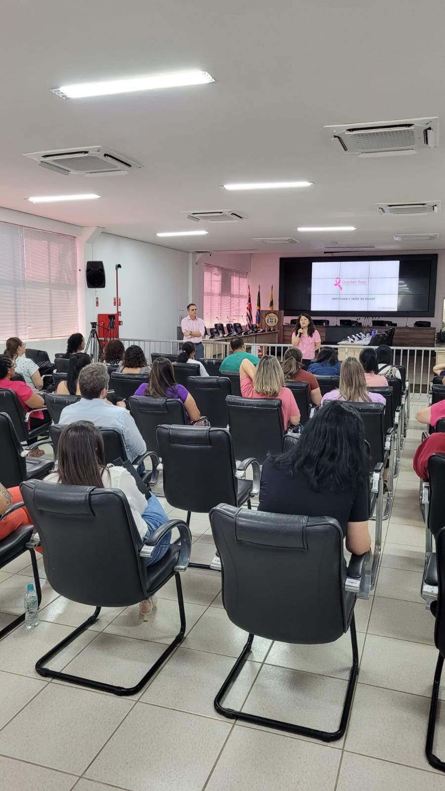Umas das atividades foi uma palestra organizada pelo CAISM (Centro de Atenção Integral à Saúde da Mulher), órgão da Secretaria de Saúde, nesta terça-feira (15/10). Um mastologista do órgão deu orientações sobre Câncer de Mama e autocuidado para cerca de 100 funcionárias das Atenções Primária e Especializada. A palestra aconteceu nos períodos matutino e vespertino, na Câmara Municipal.