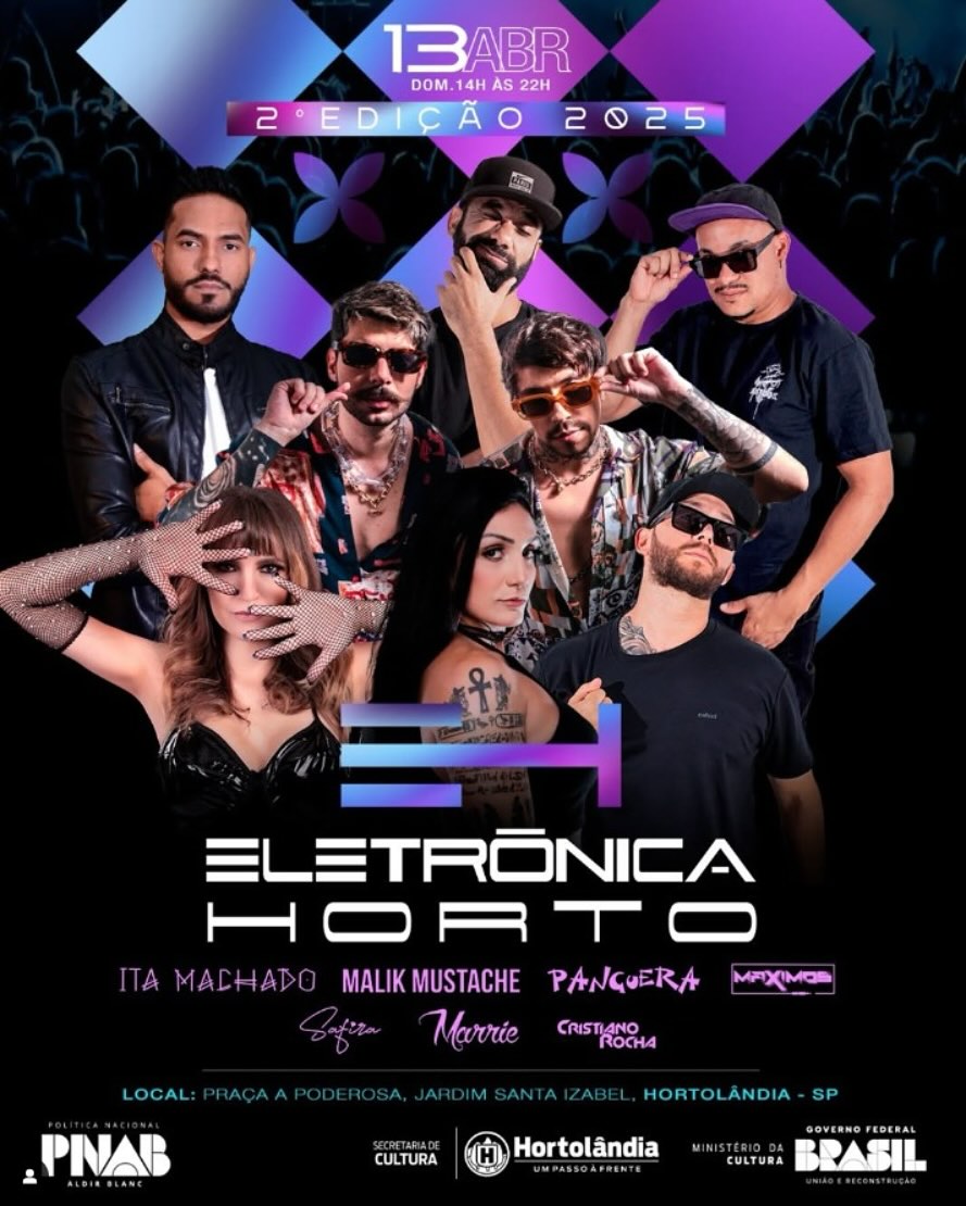Você vai estar de bobeira em Hortolândia neste fim de semana? Então, se liga! O município terá programação cultural movimentada com projetos contemplados, com entrada gratuita, pelo edital federal da PNAB (Política Nacional Aldir Blanc), divulgado pela Prefeitura de Hortolândia, no ano passado. O grande destaque é o 2º Festival Eletrônica Horto, que acontece neste domingo (13/04). O evento será, às 14h, na Praça A Poderosa, localizada na rua Ercilio Antonio Meira, 241, Jardim Santa Izabel.