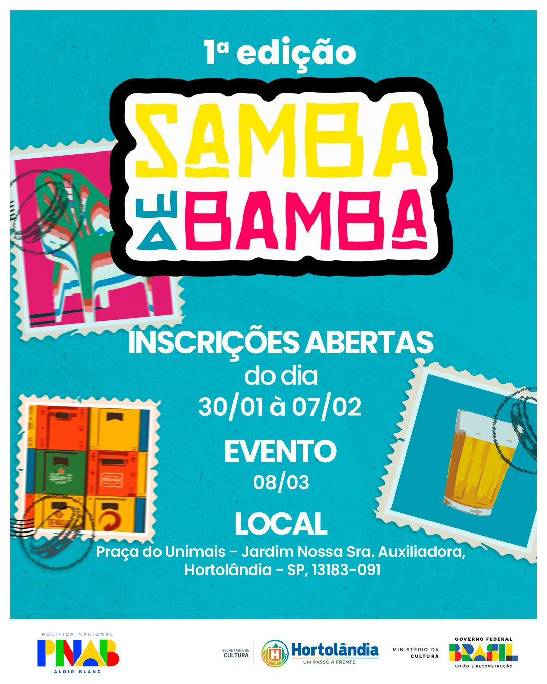 O samba vai ocupar espaços públicos de Hortolândia. Isso irá acontecer em breve graças ao projeto Samba de Bamba. Idealizado pelo coletivo de mesmo nome, o projeto irá selecionar quatro grupos de samba da cidade e região para se apresentarem em um evento. Os interessados em participar do processo seletivo devem fazer inscrição por meio de formulário on-line que pode ser acessado por este LINK. O prazo de inscrições termina no dia 07/02. O projeto Samba de Bamba é um dos contemplados pelo edital federal da PNAB (Política Nacional Aldir Blanc), divulgado no ano passado pela Prefeitura de Hortolândia.