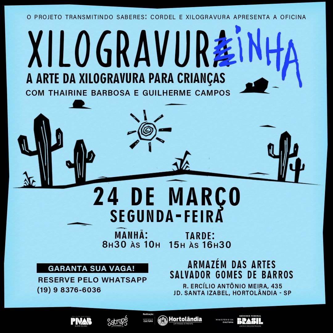 A oficina é para crianças de 6 a 12 anos, por isso recebeu o nome de xilogravurinha. A atividade acontecerá no Armazém das Artes Salvador Gomes de Barros, localizado na rua Ercilio Antonio Meira, 435, Jardim Santa Izabel, próxima à praça A Poderosa.