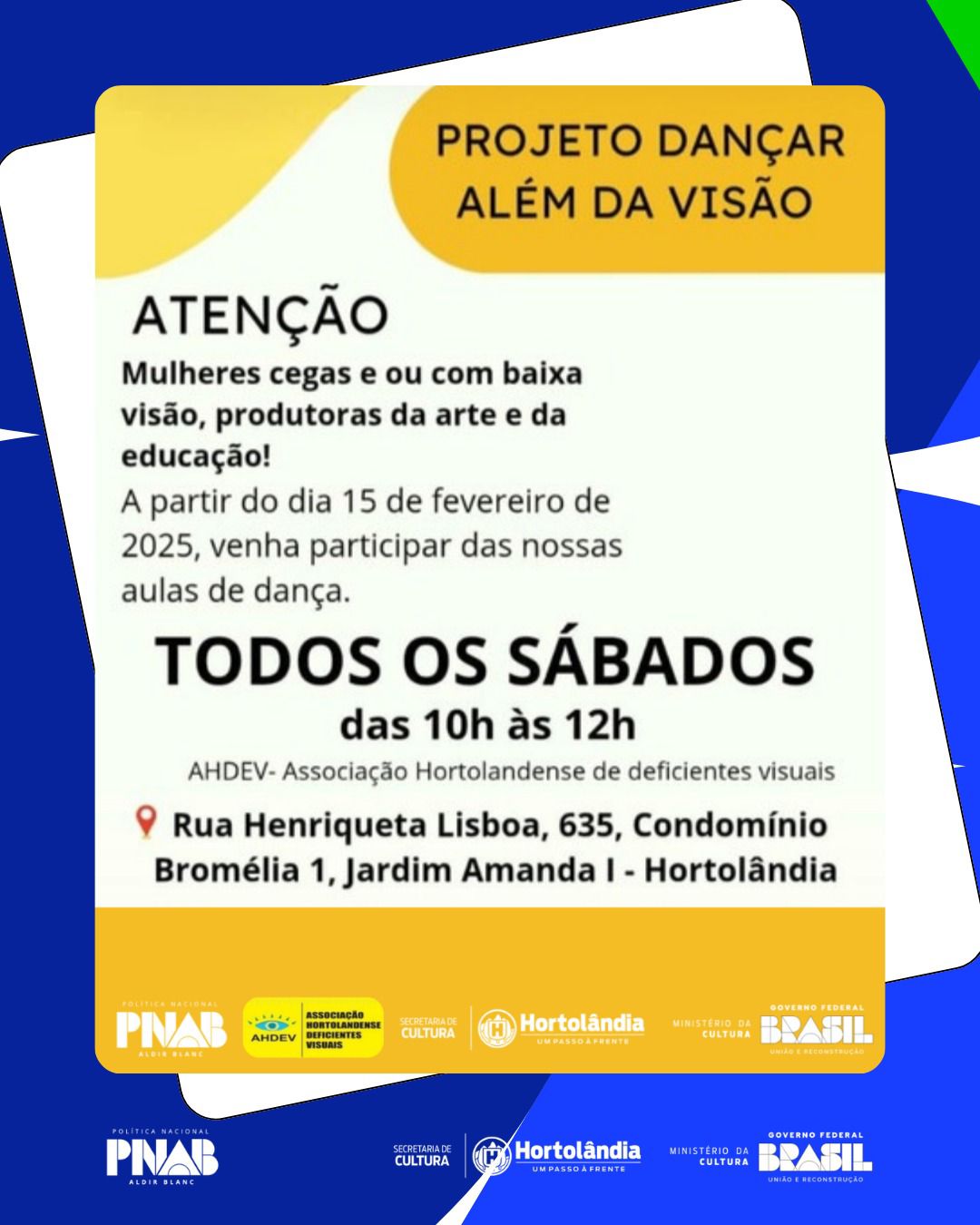 Neste sábado (15/02), o projeto “Dançar além da visão” começa a oferecer aulas de dança para mulheres com deficiência visual ou baixa visão. A aula inaugural será, às 10h, na sede da AHDEV (Associação Hortolandense de Deficientes Visuais), localizada no condomínio Bromélias I, cujo endereço é rua Henriqueta Lisboa, 635, Jardim Amanda I.