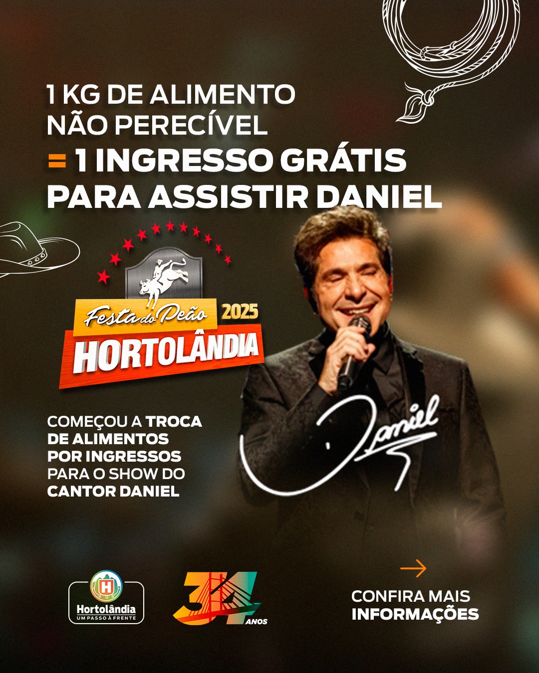 Hortolândia completará 34 anos de emancipação política nesta segunda-feira (19/05). Na data exata do aniversário, os organizadores do “Rodeio 2025” trarão à cidade uma das atrações mais esperadas por quem aprecia o chamado “sertanejo romântico”, o show do cantor Daniel. Parte do evento será revertido em prol da campanha “Hortolândia Solidária”, realizada pelo FunSol (Fundo Social de Solidariedade), em parceria com a Prefeitura.