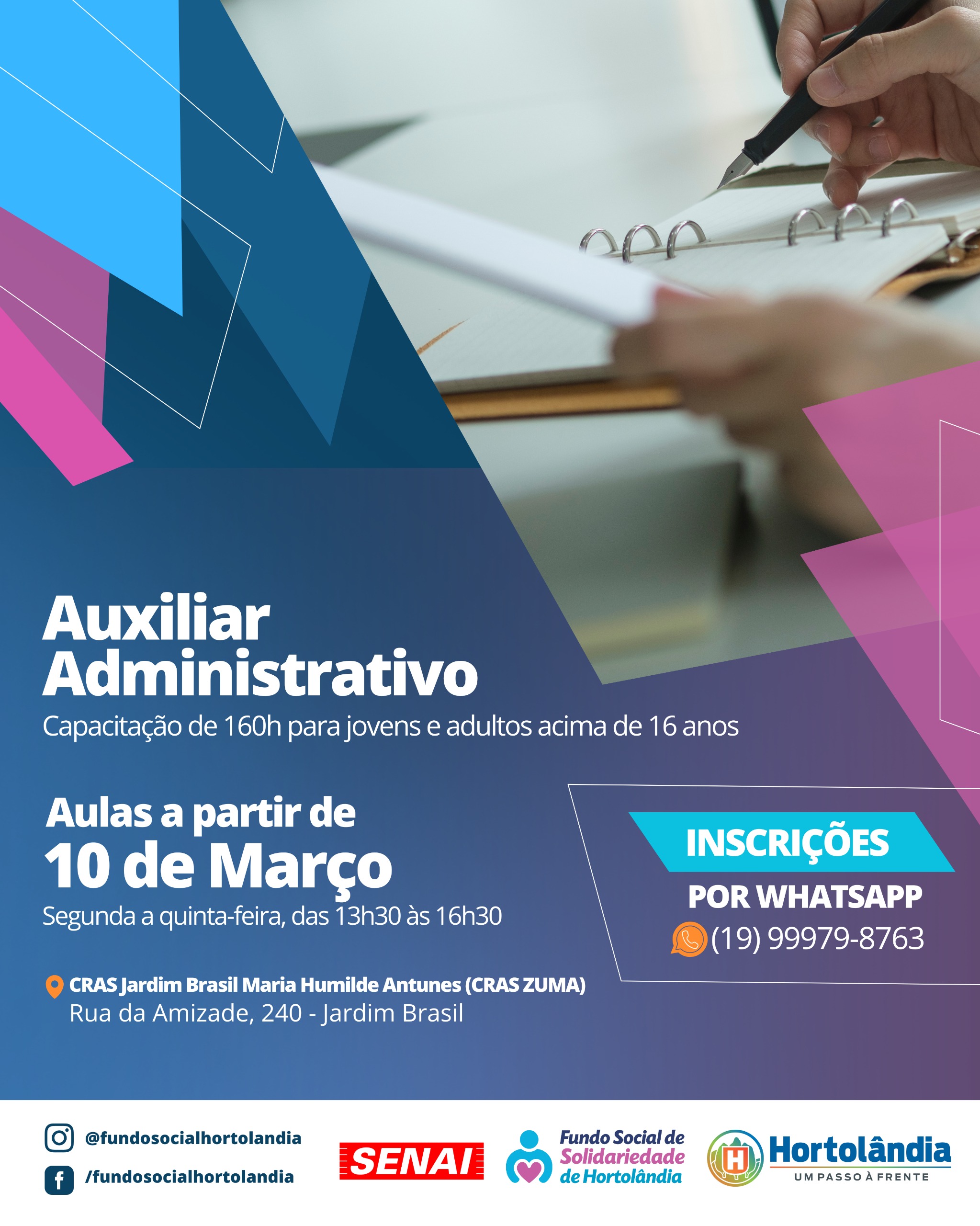 Já estão abertas as inscrições para o curso de “Auxiliar Administrativo”, promovido por meio da parceria entre o Fundo Social de Solidariedade de Hortolândia e o Senai (Serviço Nacional de Aprendizagem Industrial).