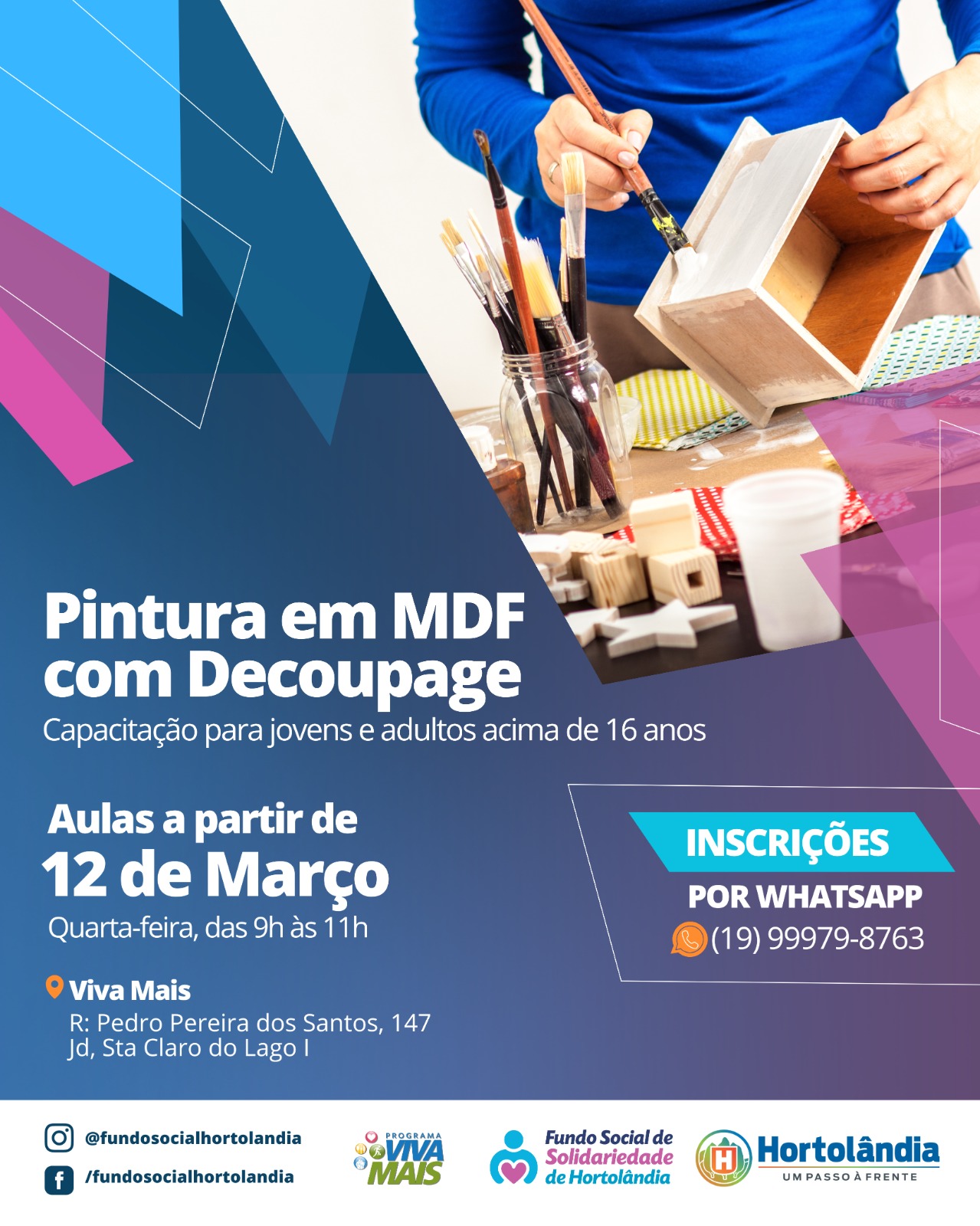 Estão abertas as inscrições para dois cursos de artesanato, promovidos por meio da parceria entre o Fundo Social de Solidariedade de Hortolândia e o programa “Viva Mais” da Secretaria de Governo da Prefeitura. São eles: “Pintura em MDF com Decoupage” e “Papelaria Criativa”.