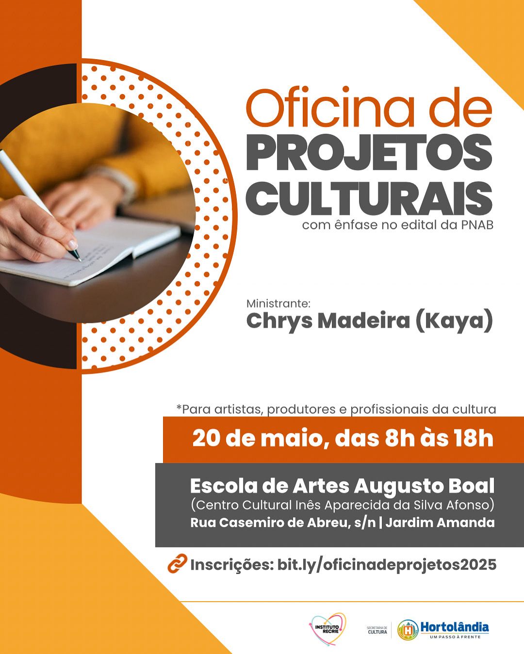 Atenção, fazedores culturais de Hortolândia! A Prefeitura promoverá uma oficina de projetos culturais. A atividade disponibiliza 20 vagas. As inscrições devem ser feitas por meio deste LINK. A oficina será ministrada na próxima terça-feira (20/05), das 8h às 18h, na Escola de Artes Augusto Boal, localizada na rua Casemiro de Abreu, s/nº, Jardim Amanda. A oficina é realizada pela Prefeitura e a OS (Organização Social) Recrie, parceira do município.