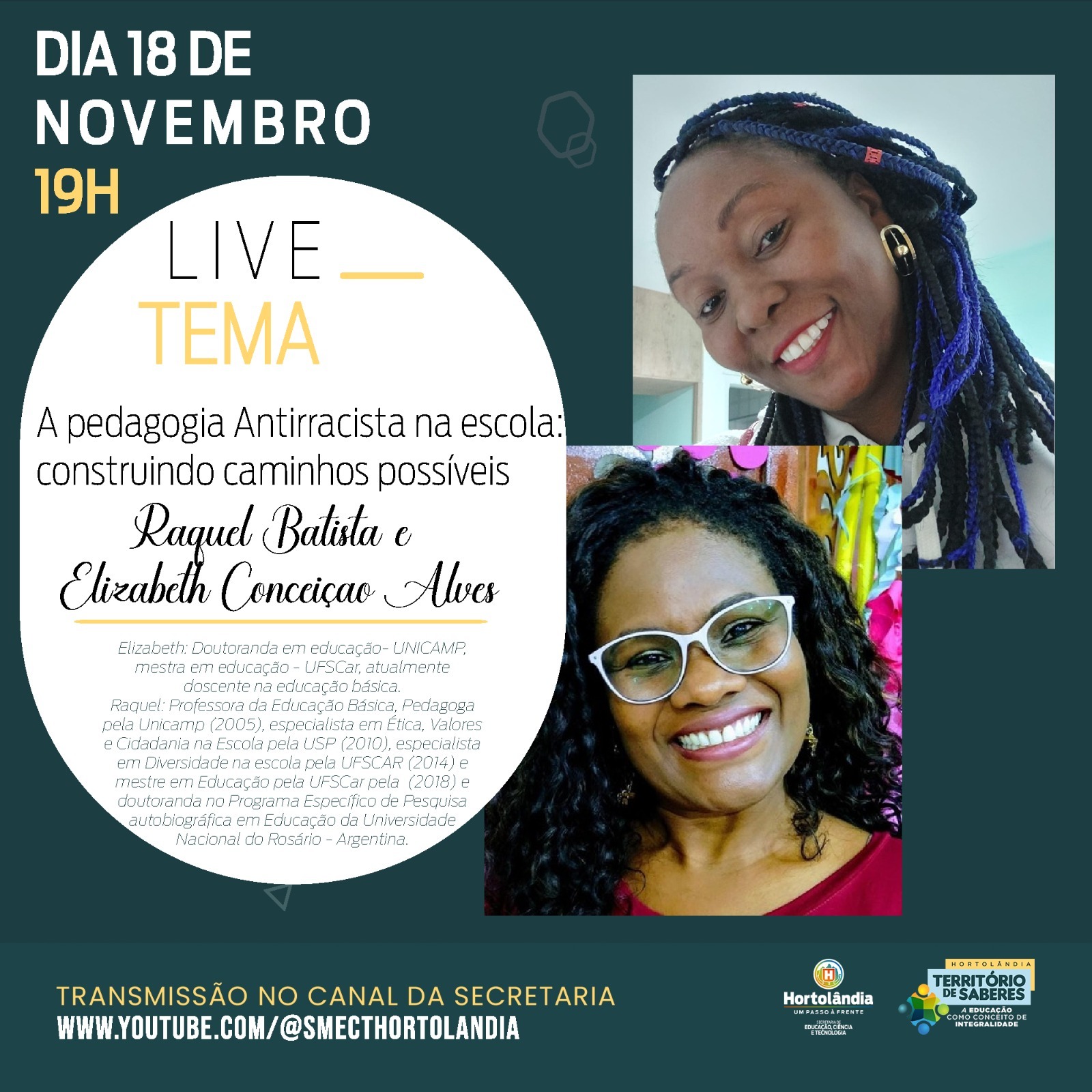 O tema será abordado pelas pedagogas e professoras da educação básica Raquel Batista e Elisabeth Conceição Alves. Elisabeth é doutoranda em Educação pela Unicamp e possui mestrado em Educação pela UFSCar. Já Raquel é especialista em Ética, Valores e Cidadania na Escola pela USP, em Diversidade na Escola pela UFSCar e mestre em Educação também pela UFSCar, além de doutoranda em Pesquisa Autobiográfica em Educação pela Universidade Nacional de Rosário, na Argentina.