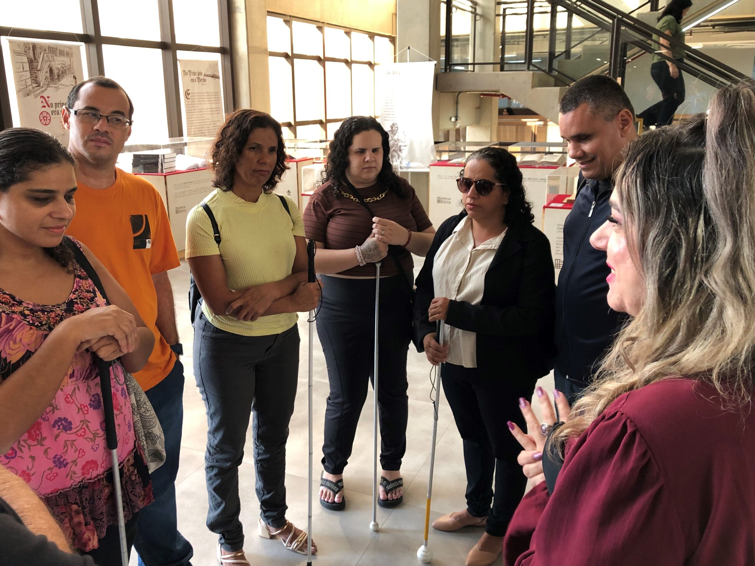 A deficiente visual explicou que a entidade realiza ações para promover a inclusão e a integração de deficientes visuais à vida em sociedade. A visita à exposição foi uma atividade prática de leitura em Braille, que é ensinada pela própria entidade.