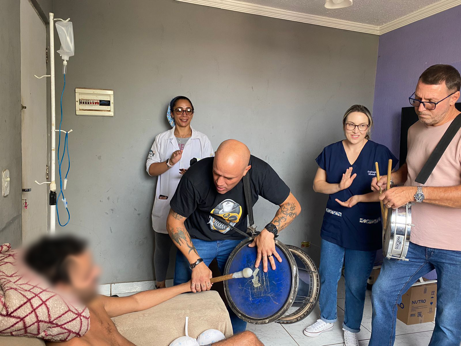 Durante a visita, o paciente ficou tão animado que tocou percussão junto com a equipe. “Foi um momento emocionante. Nós o estimulamos, e ele tocou com a gente. Cantamos para ele algumas músicas de samba. Esse projeto piloto em parceria com a Secretaria de Saúde é uma experiência muito gratificante, pois levamos alegria e música para os pacientes. Eles se emocionaram muito com as visitas”, destaca o servidor municipal Alexandre Amaro, coordenador do projeto de atividades adaptadas com percussão do DDH.