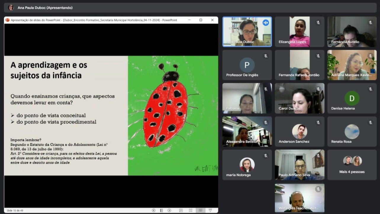 Professores de Língua Inglesa da rede municipal de ensino de Hortolândia participaram da Formação Continuada online “Multiletramentos/sujeitos da infância”, promovida pela Prefeitura, na noite desta segunda-feira (04/11). Segundo a Secretaria de Educação, Ciência e Tecnologia, a formação buscou promover reflexões entre os docentes sobre o ensino de inglês para crianças. A ação beneficia aproximadamente 14 mil estudantes de 1º a 5º ano do Ensino Fundamental na rede municipal.