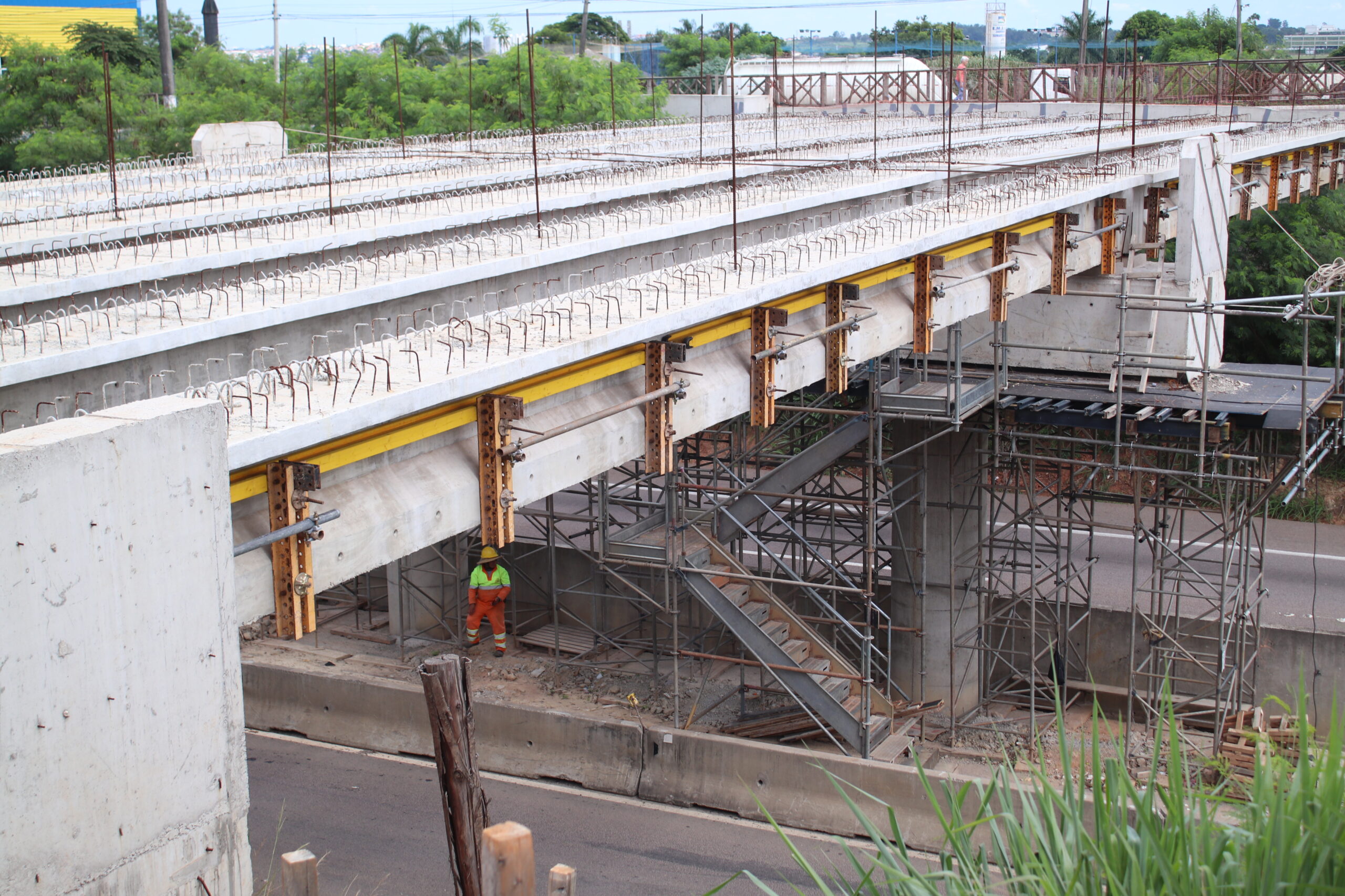 No canteiro de obras, operários realizavam serviços nas estruturas de base do viaduto. Com a intensificação o serviço, o trabalho nas partes de sustentação e concretagem estão em ritmo acelerado. No final do ano passado, o dispositivo  recebeu as novas vigas, estruturas horizontais que vão dar suporte ao viaduto. De acordo com a Secretaria de Obras, a obra está atualmente com 80% de etapas executadas e a previsão é que seja finalizada até o primeiro semestre de 2025.