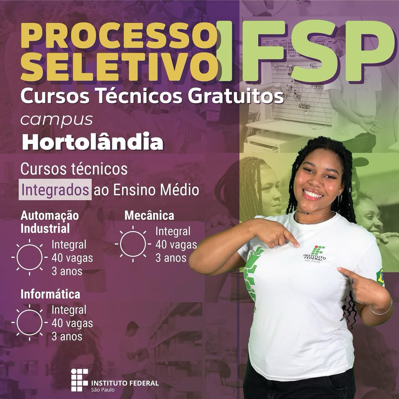 O IFSP (Instituto Federal de Educação, Ciência e Tecnologia de São Paulo) está com inscrições abertas, até o dia oito de setembro, para seis cursos técnicos gratuitos disponibilizados no câmpus Hortolândia: três deles integrados ao Ensino Médio e três concomitantes. Segundo a CDI (Coordenadoria de apoio à Direção) da instituição, há 205 vagas disponíveis no município. O processo seletivo aberto é para ingresso no primeiro semestre de 2025.