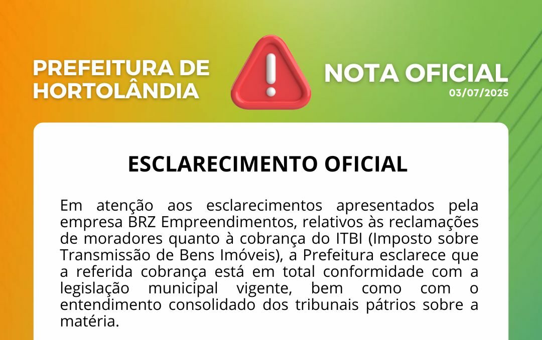 Em atenção aos esclarecimentos apresentados pela empresa BRZ Empreendimentos, relativos às reclamações de moradores quanto à cobrança do ITBI (Imposto sobre Transmissão de Bens Imóveis), a Prefeitura esclarece que a referida cobrança está em total conformidade com a legislação municipal vigente, bem como com o entendimento consolidado dos tribunais pátrios sobre a matéria.