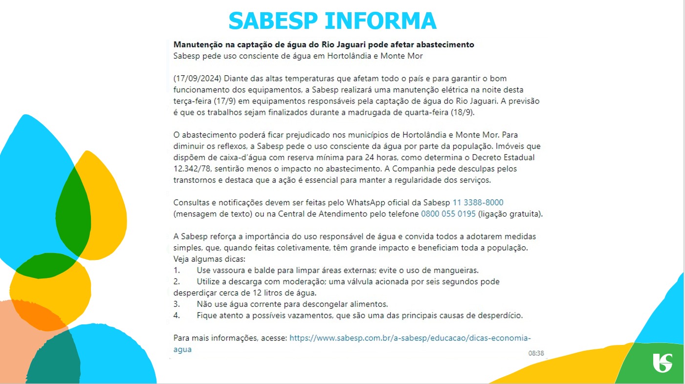 Quem mora em Hortolândia precisa estar atento a este aviso da Sabesp (Companhia de Saneamento Básico do Estado de São Paulo), com relação ao uso consciente da água. A cidade poderá passar por problemas pontuais de abastecimento, nesta quarta-feira (18/09), em razão do serviço de manutenção elétrica que a companhia fará, na noite desta terça-feira (17/09), em equipamentos responsáveis pela captação de água do Rio Jaguari.