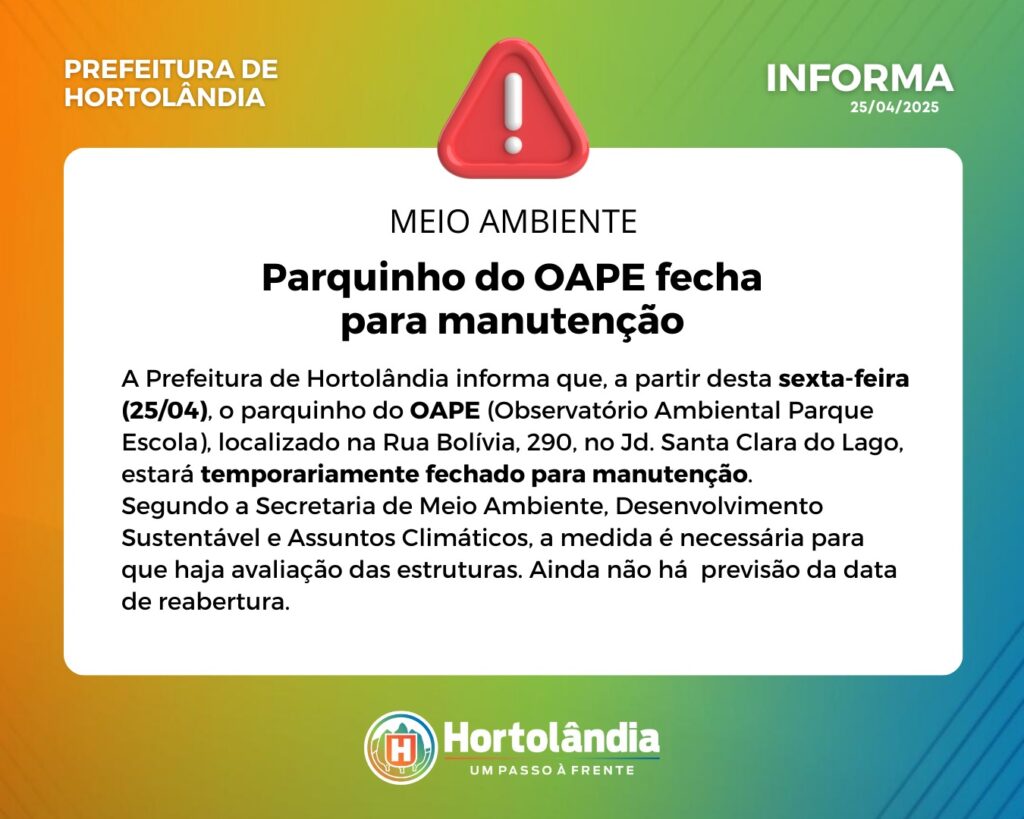 A Prefeitura de Hortolândia informa que, a partir desta sexta-feira (25/04), o parquinho do OAPE (Observatório Ambiental Parque Escola), localizado