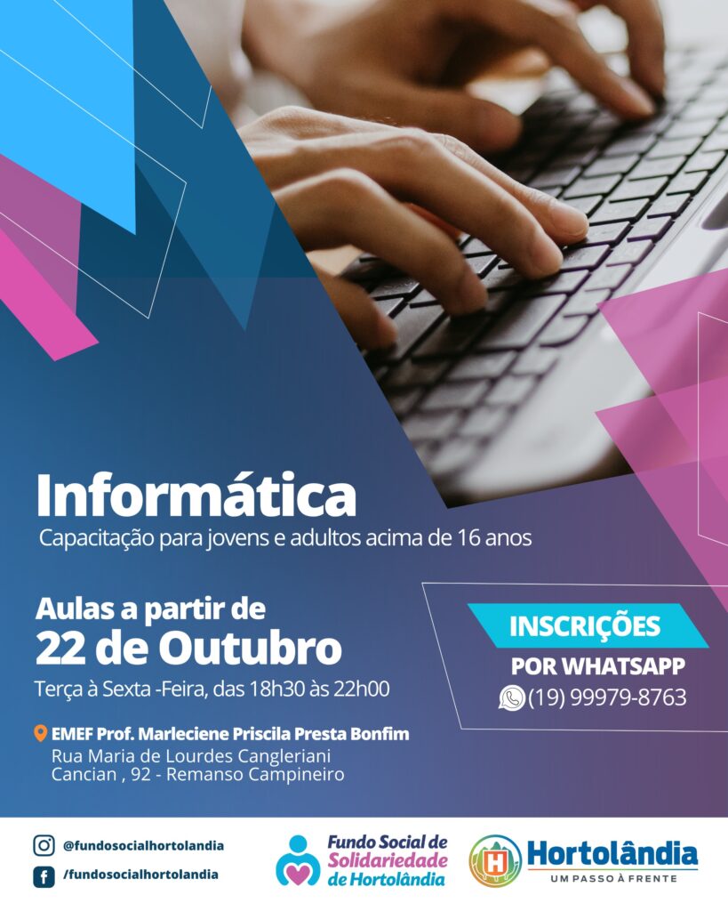 Capacitação é voltada a jovens e adultos, moradores de Hortolândia, com 16 anos ou mais O Fundo Social de Hortolândia