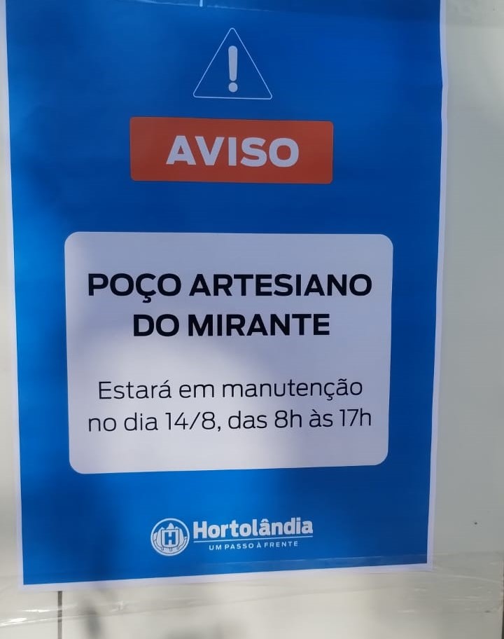 Fornecimento de água será interrompido pela Prefeitura de Hortolândia das 7h às 17h Nesta quinta-feira (14/08), o poço artesiano do