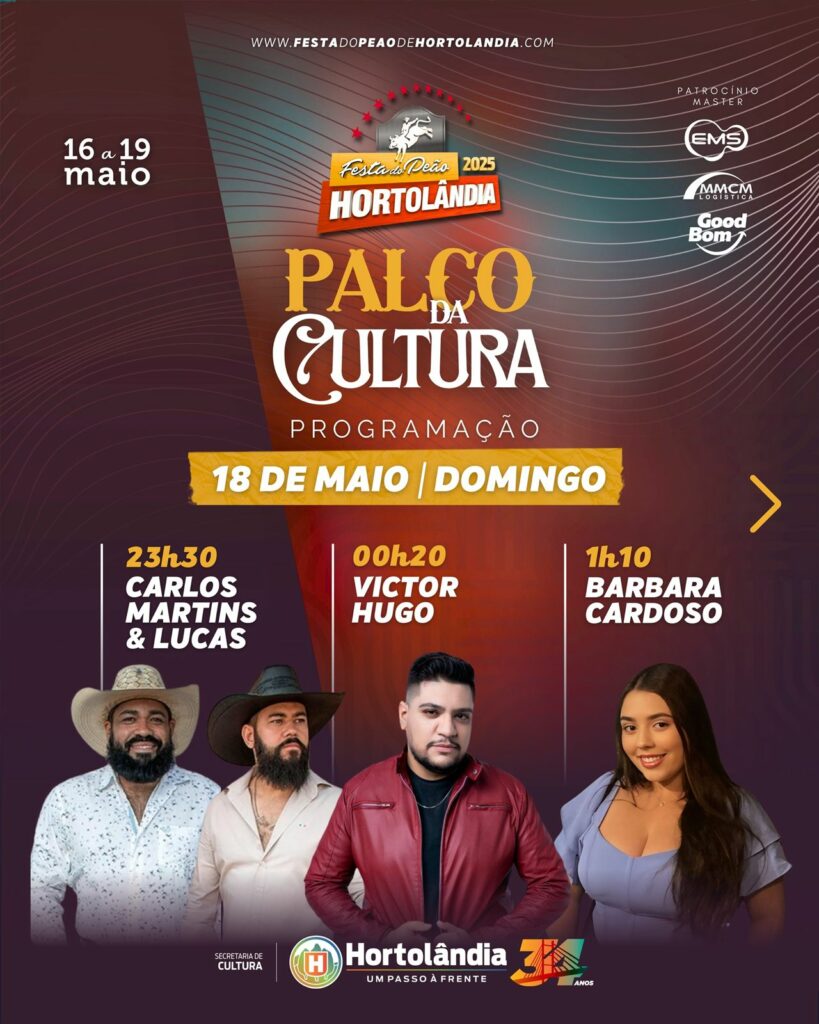 Palco promovido pela Prefeitura terá os shows de Carlos Martins & Lucas, Vitor Hugo e Barbara Cardoso, neste domingo (18/05)